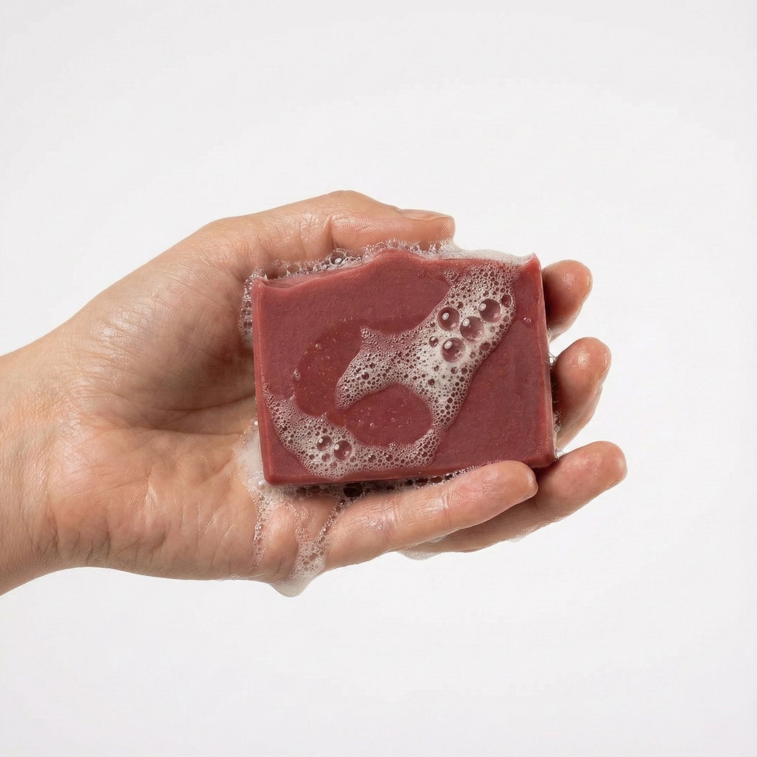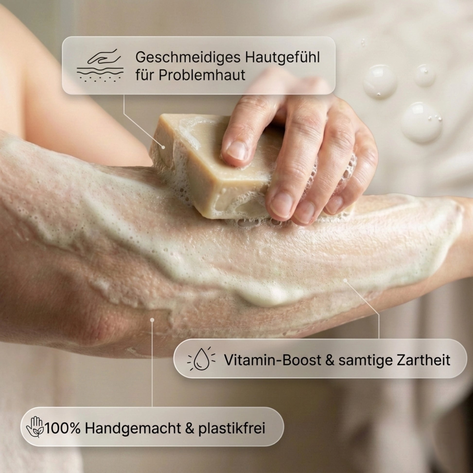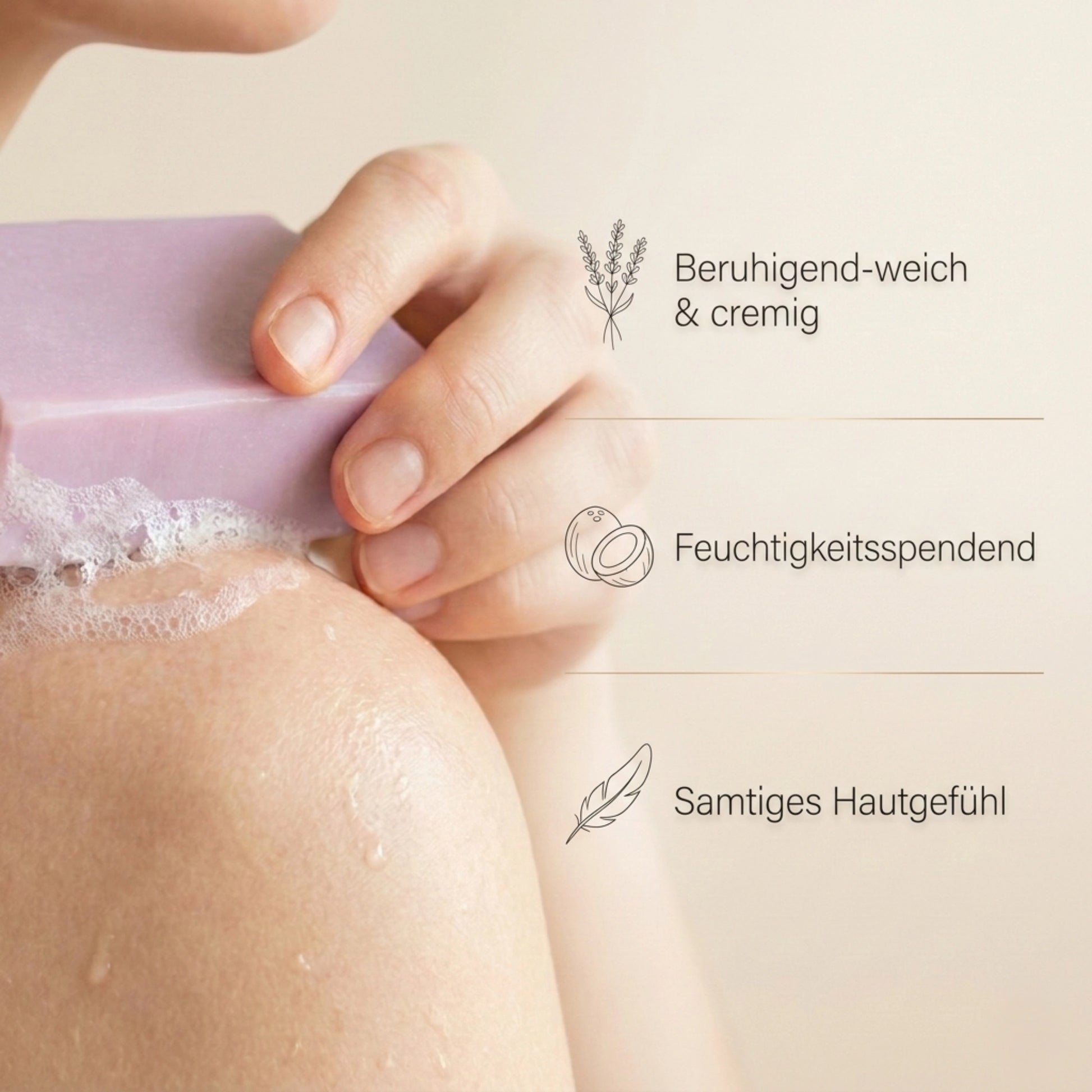 Befeuchte die Seife mit Wasser und schäume sie in den Händen oder direkt auf der Haut auf. Sanft einmassieren und anschließend gründlich abspülen.