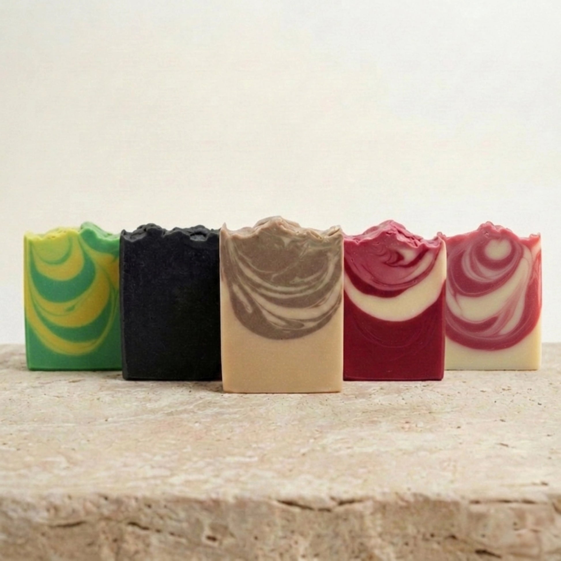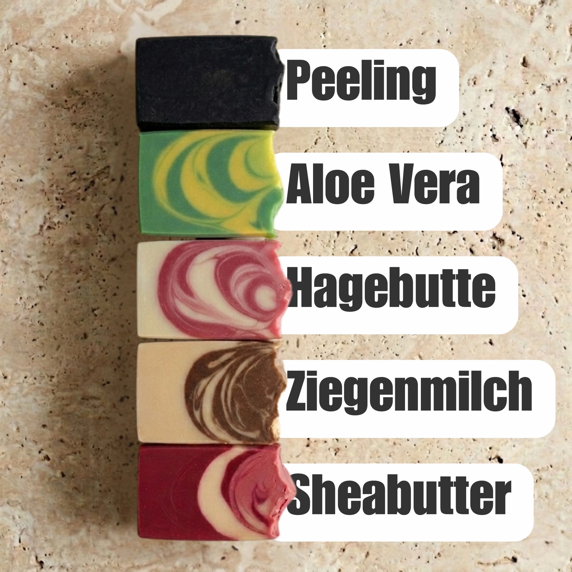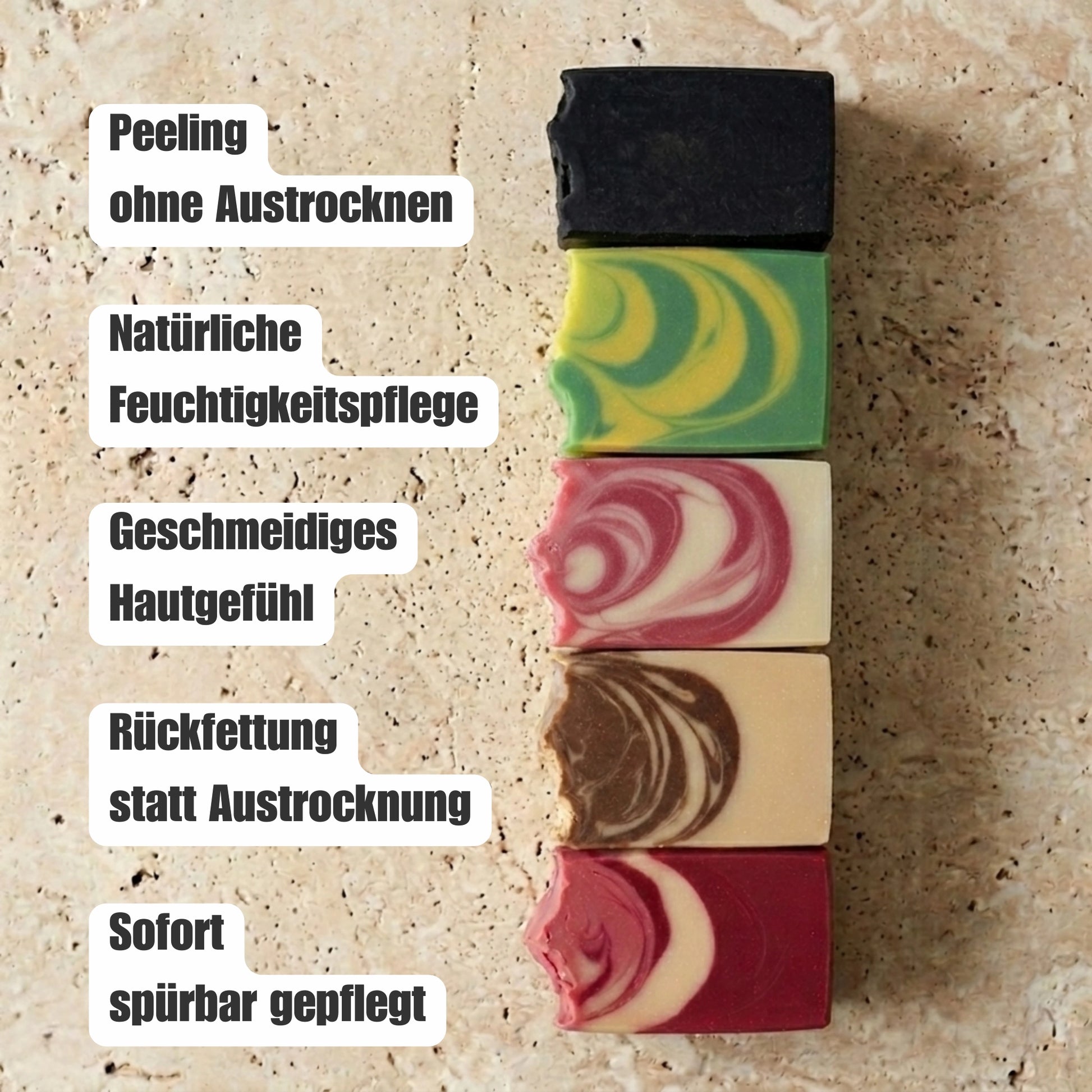 Handgemacht reinigen alle fünf Seifen sehr gründlich und pflegen gleichzeitig. Egal was deine Haut gerade braucht, du hast immer die passende Antwort parat. Kein lästiges Spannungsgefühl mehr!