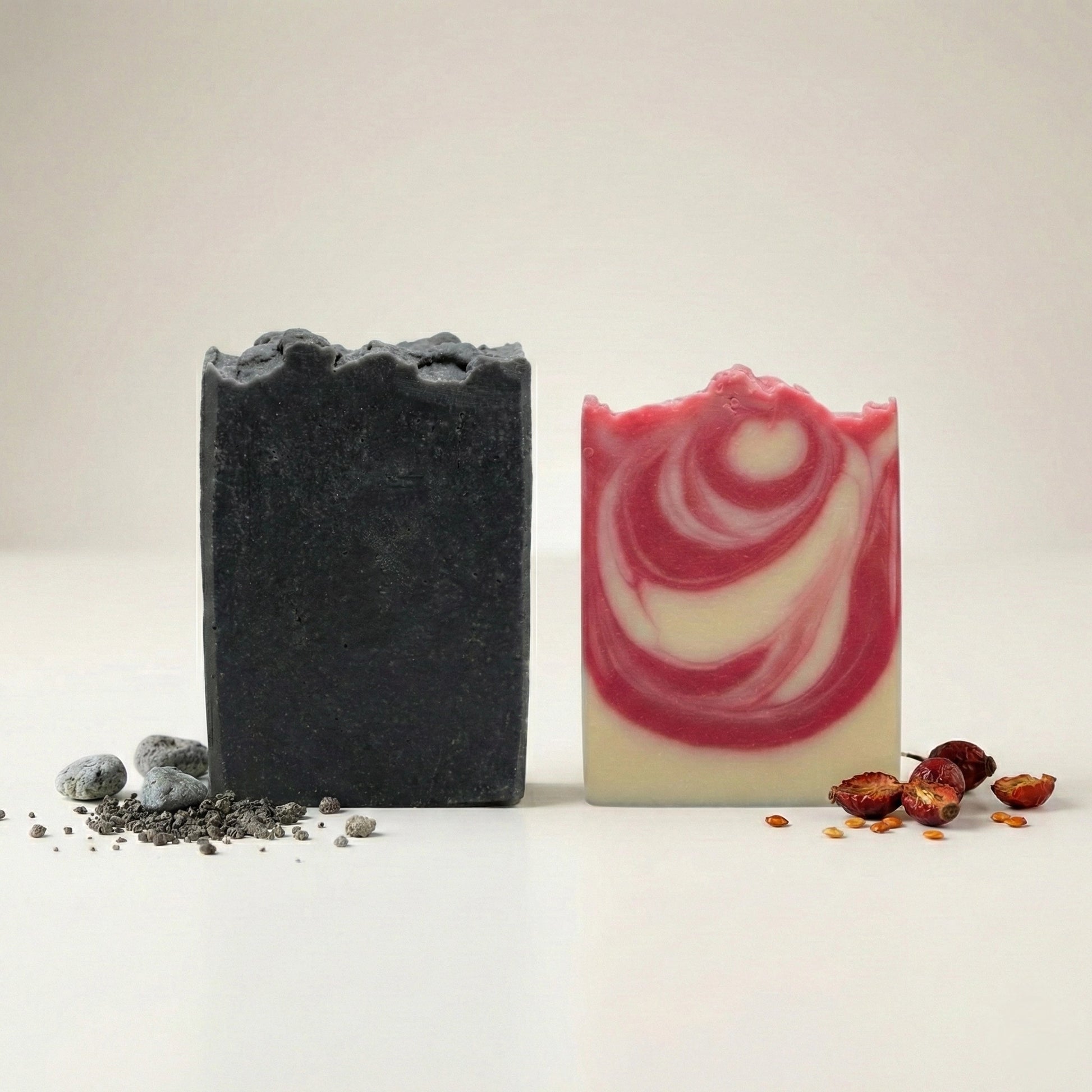 Der Mix macht den Unterschied: Fein gemahlener Bimsstein in der Peeling-Seife sorgt für porentiefe Reinheit, während die Hagebutten-Seife die Hautregeneration unterstützt und für einen natürlichen Glow sorgt. Die gemeinsame Basis aus hochwertigem Olivenöl garantiert dir dabei sofortige Geschmeidigkeit ohne Austrocknen.