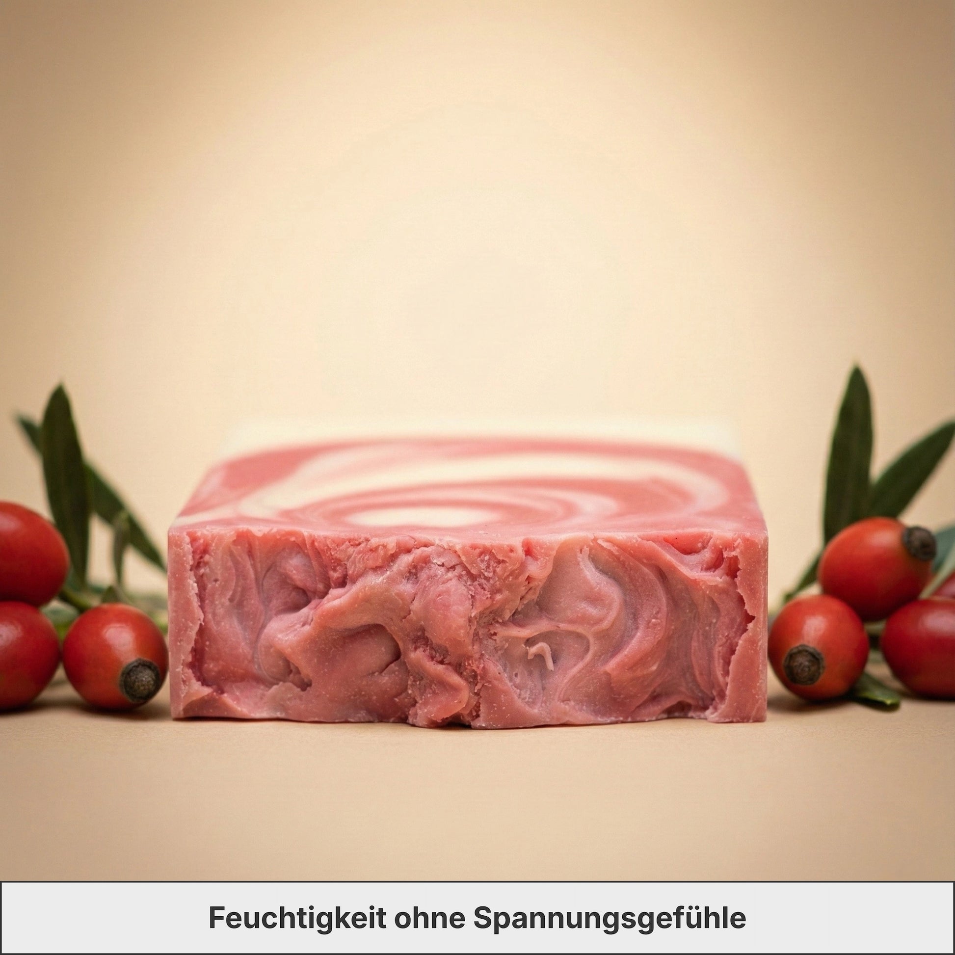 • Schritt 2 (Hagebutte): Genau jetzt braucht die „neue“ Haut Nährstoffe. Die Hagebutten-Seife liefert Vitamin C und regenerierende Öle, die nun viel tiefer eindringen können als bei ungepeelter Haut.