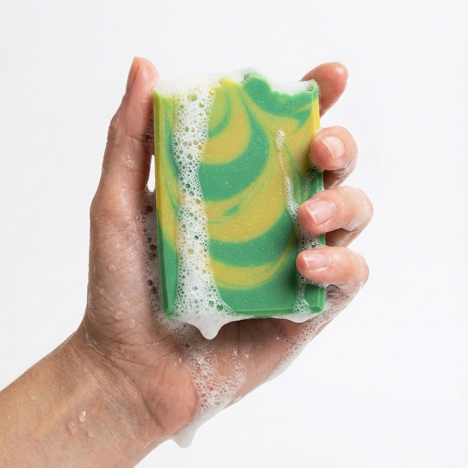 Befeuchte die Seife mit Wasser und schäume sie in den Händen oder direkt auf der Haut auf. Sanft einmassieren und anschließend gründlich abspülen.