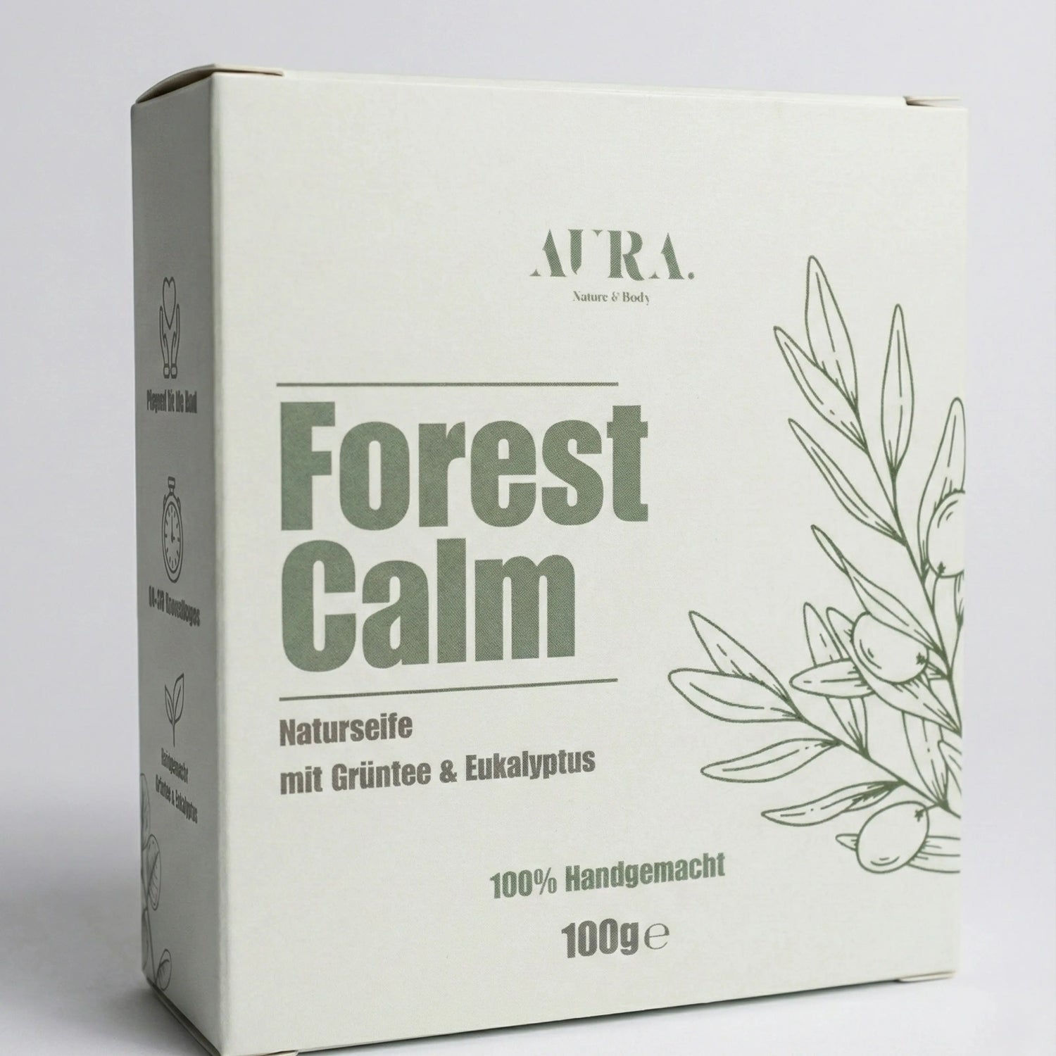 Unsere „Forest Calm" Seife ist wie ein Spaziergang im Wald. Die Kombination aus Grüntee & Eukalyptus schafft ein einzigartiges Dufterlebnis: Der klare, befreiende Eukalyptus verbindet sich mit der frischen, anregenden Note des Grüntees. Dieses Wellness-Dufterlebnis ist nicht nur eine Wohltat für die Haut, sondern auch für die Seele. Es ist der perfekte Duft, um nach einem langen Tag den Kopf freizubekommen oder morgens neue Energie zu tanken – ein Stück Natur für dein Badezimmer von Aura - Nature & Body.
