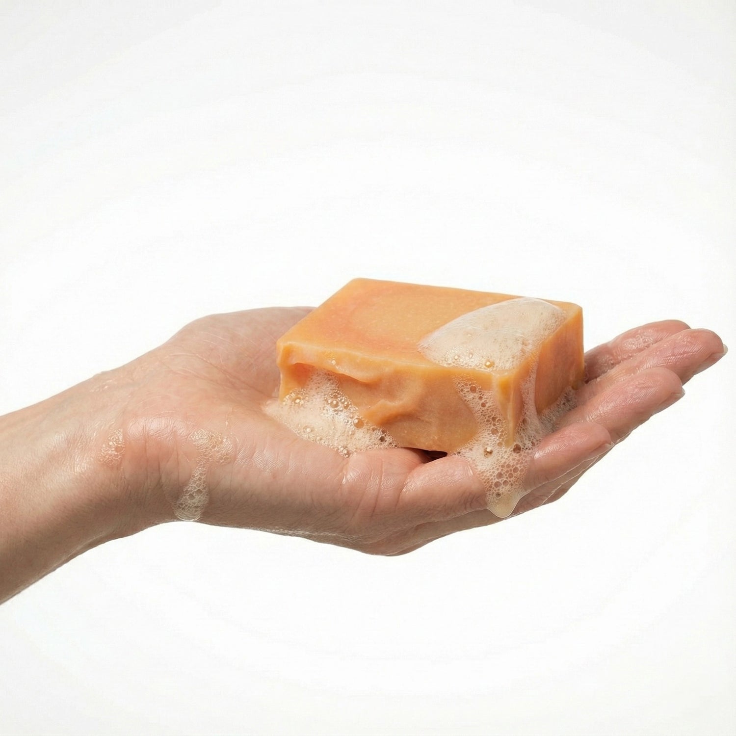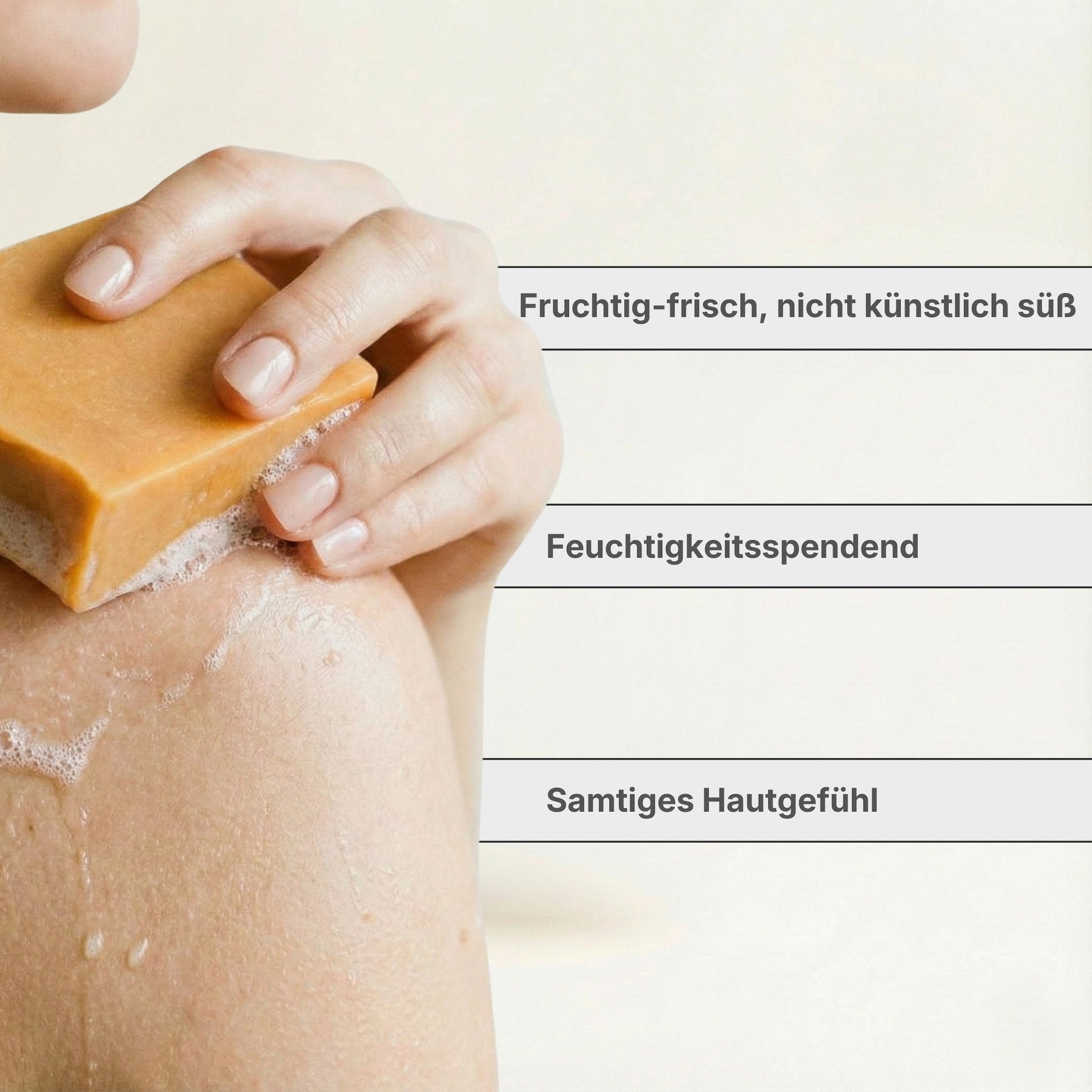 Befeuchte die Seife mit Wasser und schäume sie in den Händen oder direkt auf der Haut auf. Sanft einmassieren und anschließend gründlich abspülen.