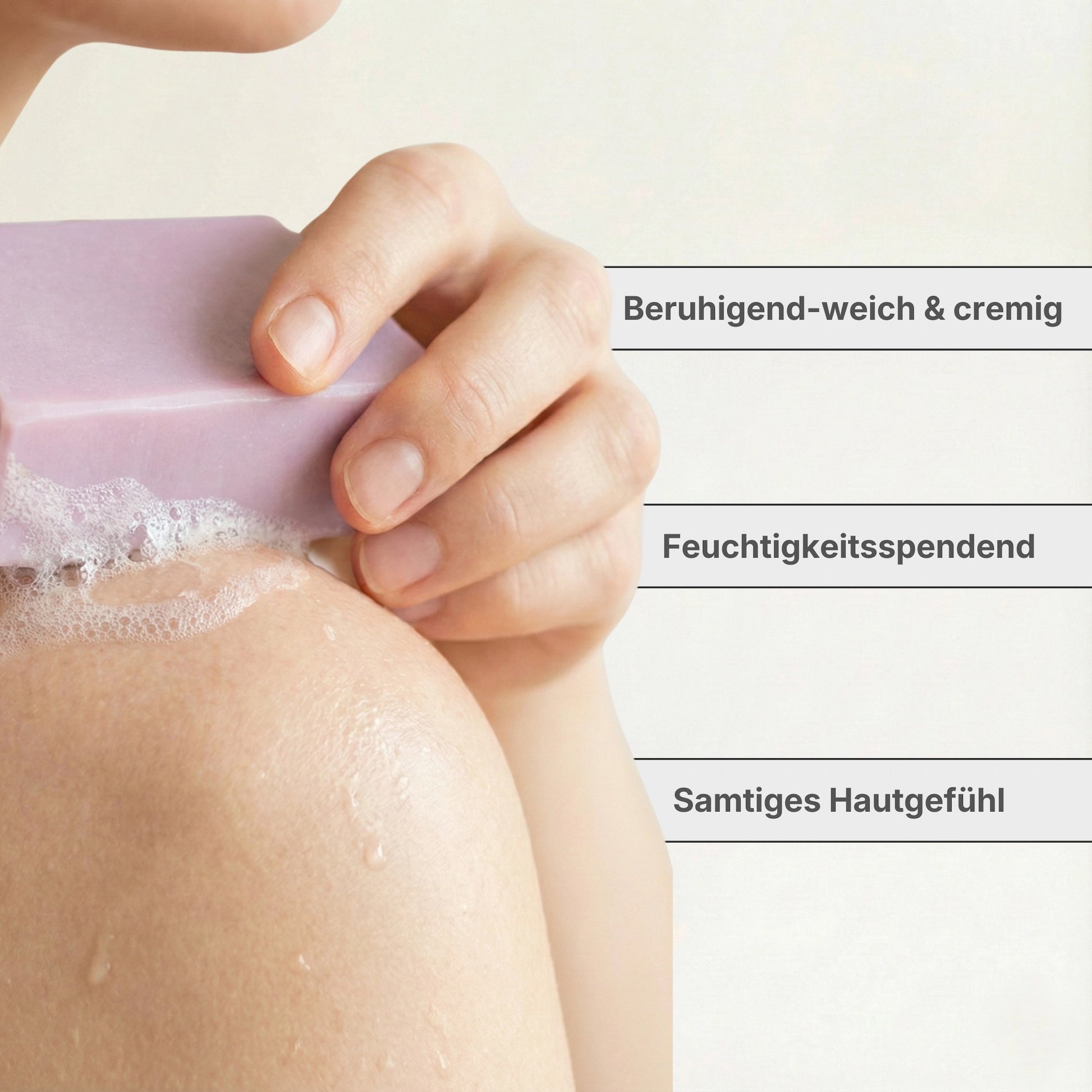 Befeuchte die Seife mit Wasser und schäume sie in den Händen oder direkt auf der Haut auf. Sanft einmassieren und anschließend gründlich abspülen.