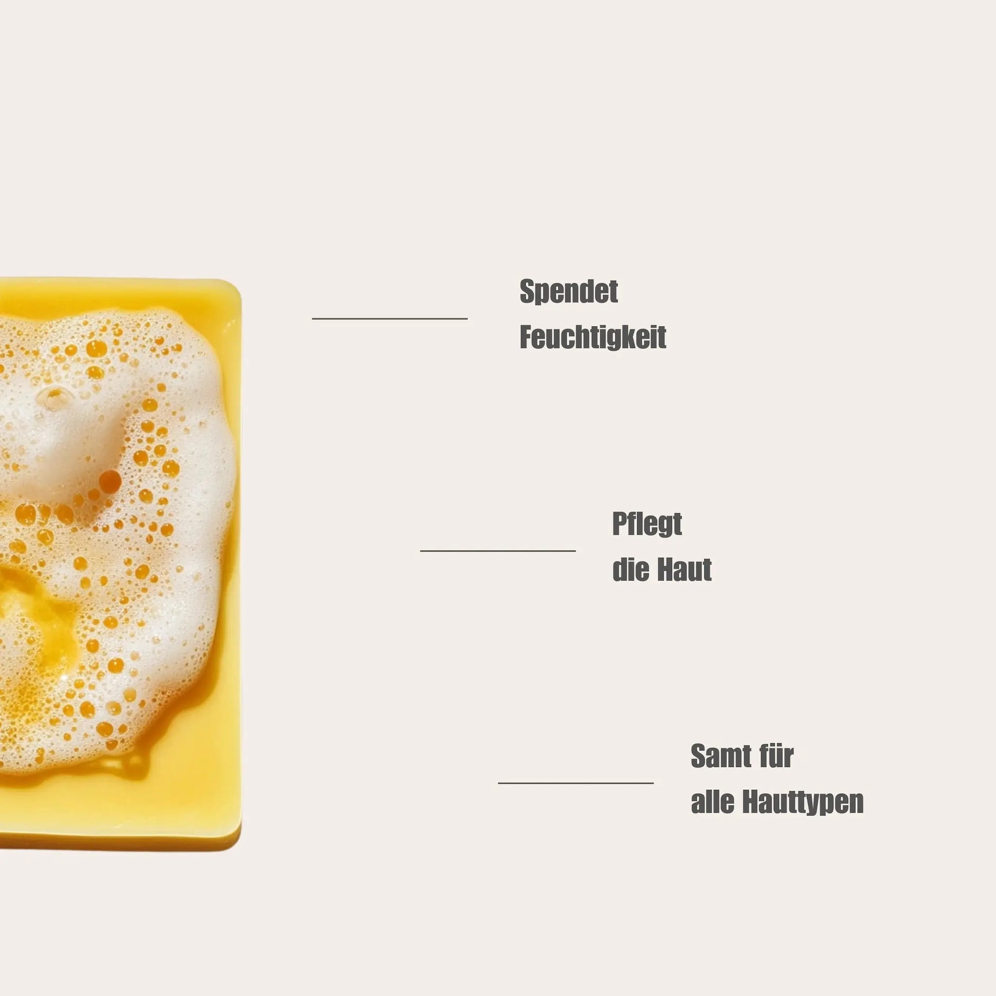 Befeuchte die Seife mit Wasser und schäume sie in den Händen oder direkt auf der Haut auf. Sanft einmassieren und anschließend gründlich abspülen.